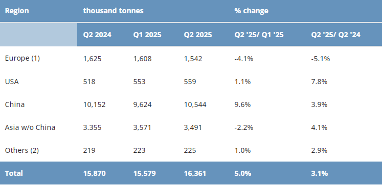 2025 年4-6月(第二季度),全球不锈钢产量较上一季度增长5%,达到1636万吨;与2024年同期相比,该数值增长3.1%。
